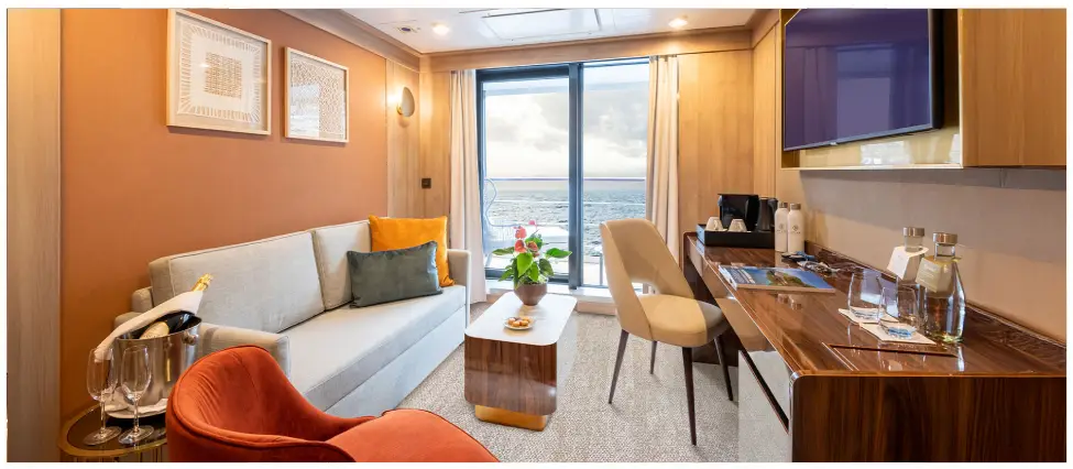 The Discovery Suite is your personal haven while sailing to your next adventure. Step from your plush bedroom or comfortable living room onto your furnished private balcony as you anticipate what new adventures await.