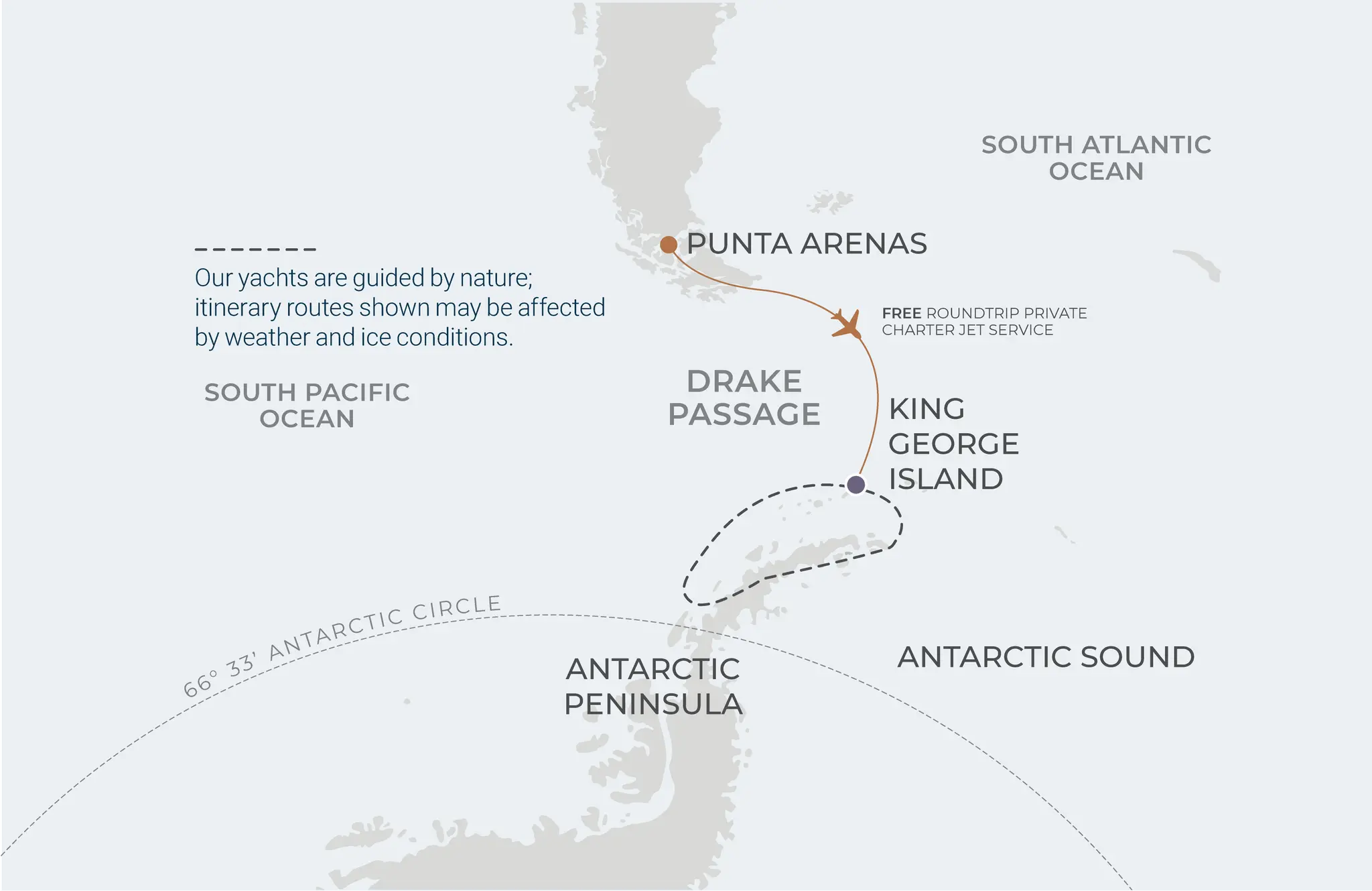 After you disembark your luxury expedition yacht, you’ll be transferred with other guests to the King George Island (TNM) airport for your charter flight to Punta Arenas (PUQ).